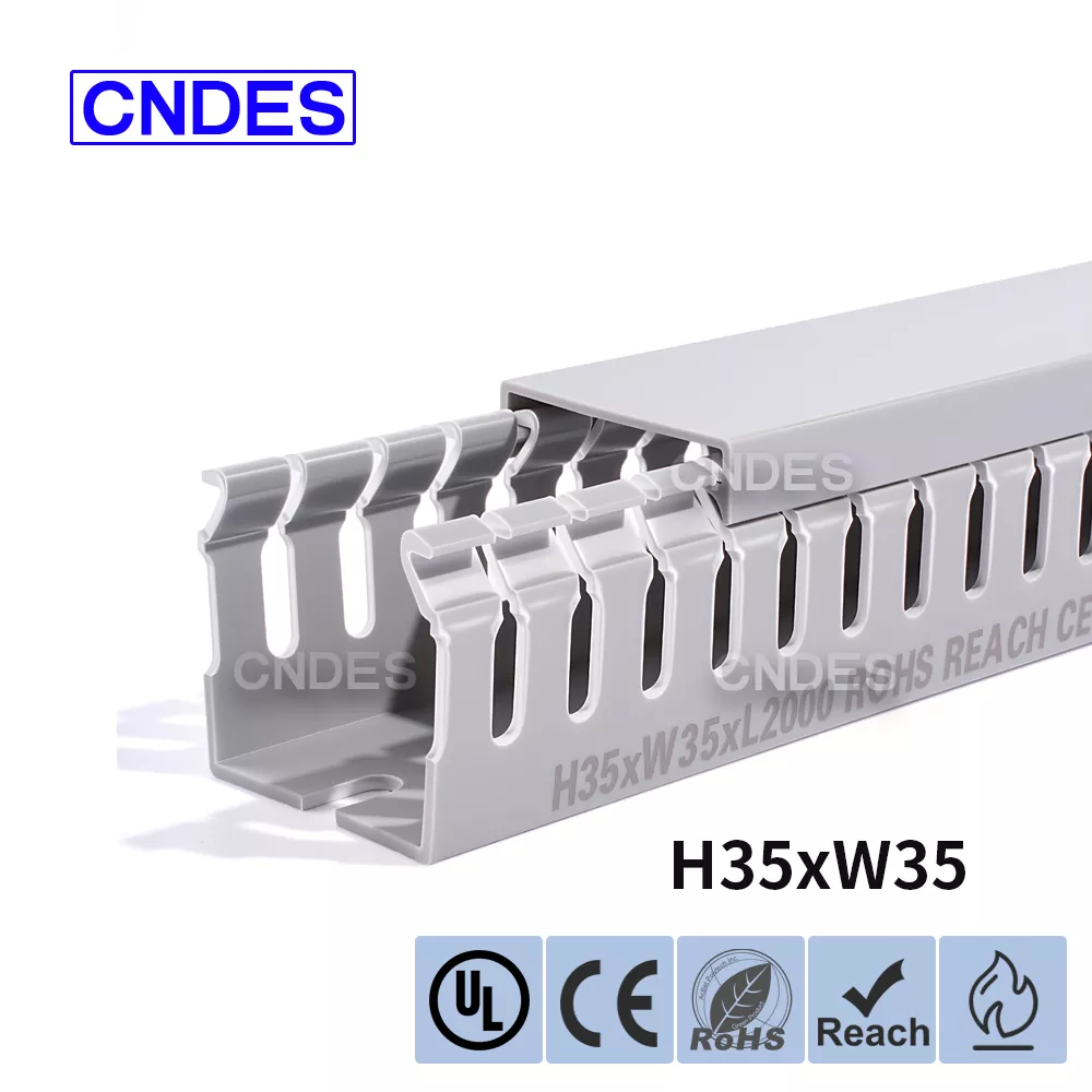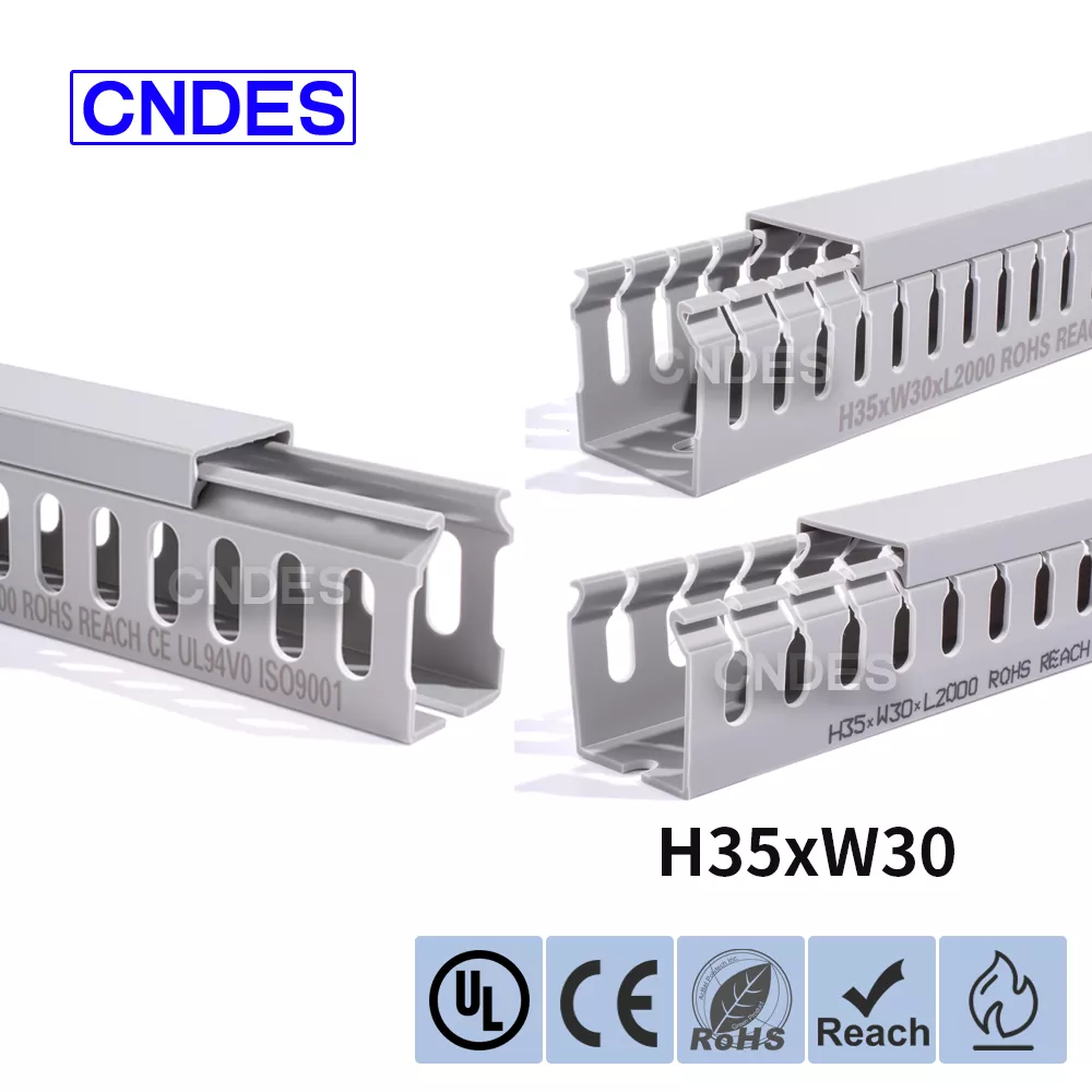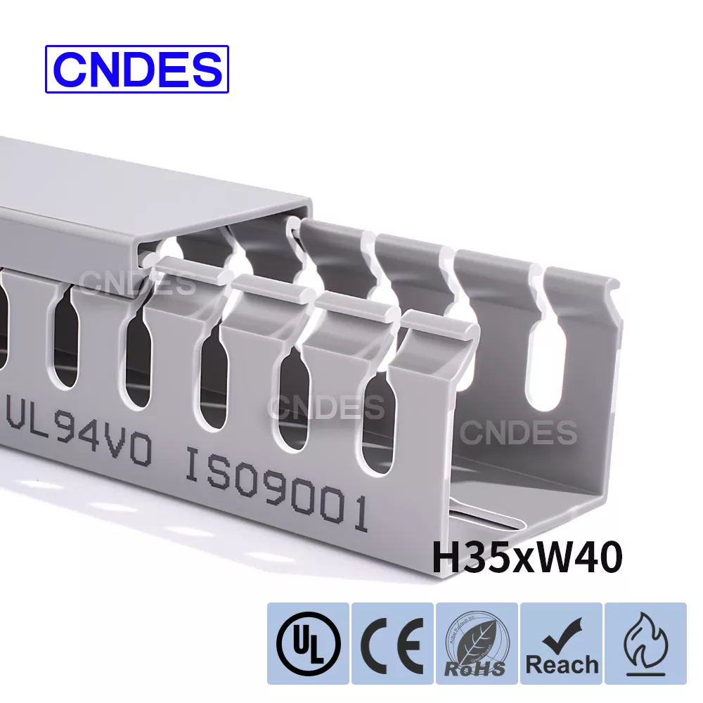Ống định tuyến dây PVC có rãnh có chiều cao 35mm tùy chỉnh, do công ty CNDES của Trung Quốc sản xuất, bao gồm đế PVC cứng và nắp có thể tháo rời. Phần đế có các rãnh giống như ngón tay cách đều nhau được dập ở cả hai bên, tạo thành "răng lược". Những chiếc răng này có thể bị gãy bằng tay, cho phép dây thoát ra theo chiều ngang từ bất kỳ vị trí nào. Nắp dễ dàng đóng lại vào đúng vị trí, duy trì vẻ ngoài gọn gàng. Một hàng lỗ lắp ở phía dưới phù hợp với khoảng cách tiêu chuẩn DIN 43659. Nó có thể được cố định nhanh chóng vào các tấm, khung tủ hoặc các cấu trúc tương tự bằng cách sử dụng vít hoặc đinh tán M5.