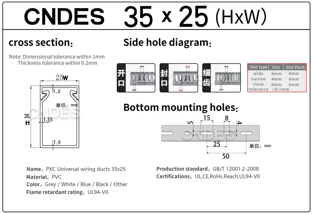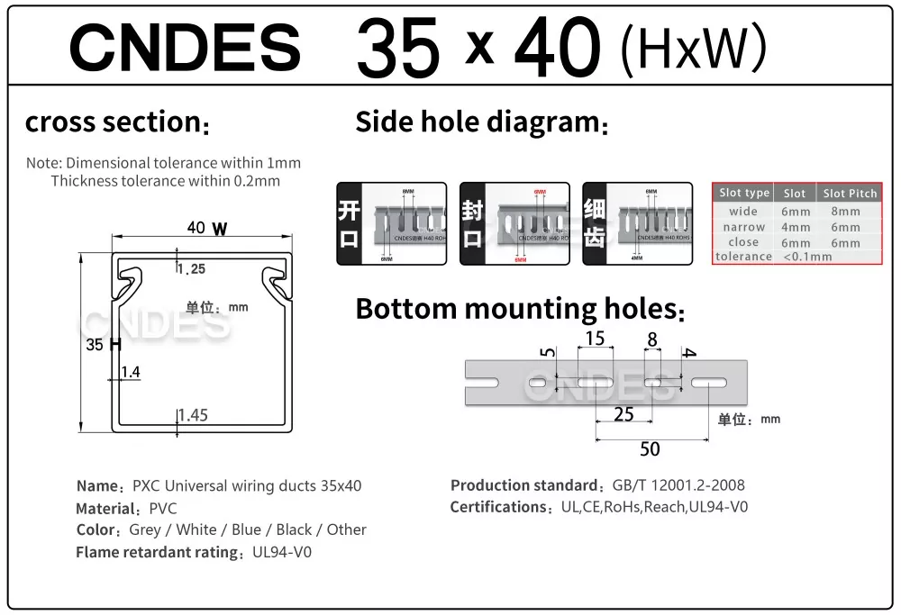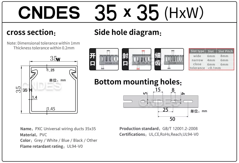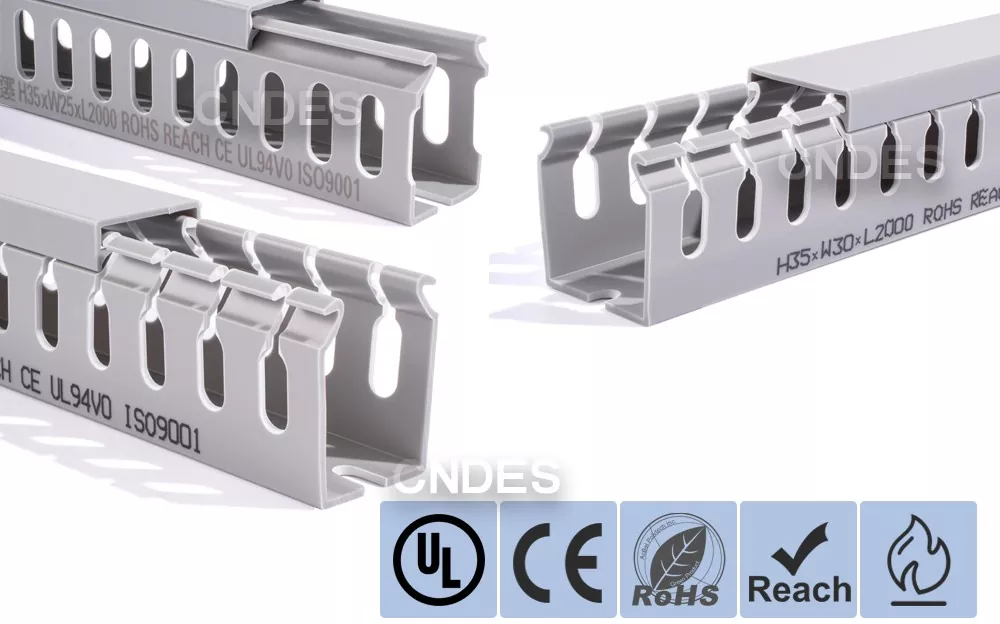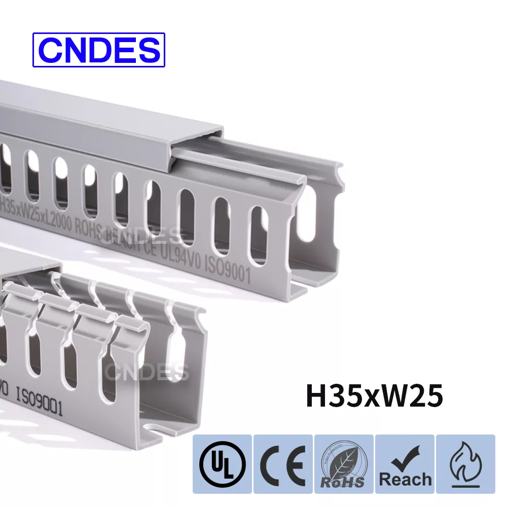Ống định tuyến dây PVC có rãnh có chiều cao 35mm tùy chỉnh, do công ty CNDES của Trung Quốc sản xuất, bao gồm đế PVC cứng và nắp có thể tháo rời. Phần đế có các rãnh giống như ngón tay cách đều nhau được dập ở cả hai bên, tạo thành "răng lược". Những chiếc răng này có thể bị gãy bằng tay, cho phép dây thoát ra theo chiều ngang từ bất kỳ vị trí nào. Nắp dễ dàng đóng lại vào đúng vị trí, duy trì vẻ ngoài gọn gàng. Một hàng lỗ lắp ở phía dưới phù hợp với khoảng cách tiêu chuẩn DIN 43659. Nó có thể được cố định nhanh chóng vào các tấm, khung tủ hoặc các cấu trúc tương tự bằng cách sử dụng vít hoặc đinh tán M5.