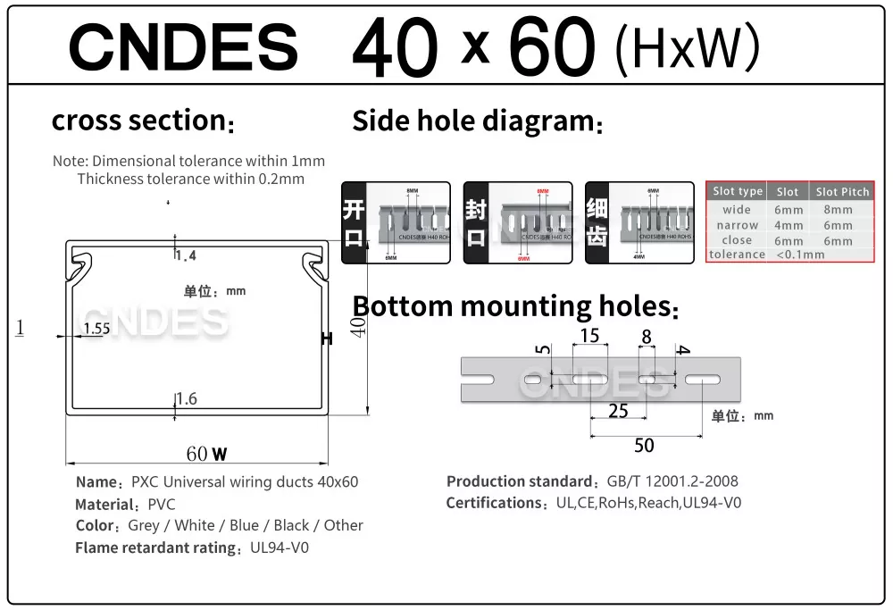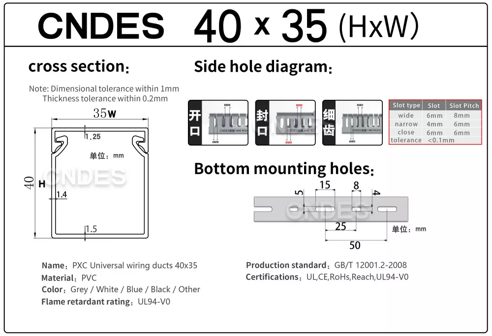 CNDES là nhà sản xuất và cung cấp ống dẫn dây PVC có rãnh hàng đầu. Sau đây chúng tôi sẽ giới thiệu các khay cáp có chiều cao 40mm, bao gồm 40*25, 40*30, 40*35, 40*40 và 40*60.