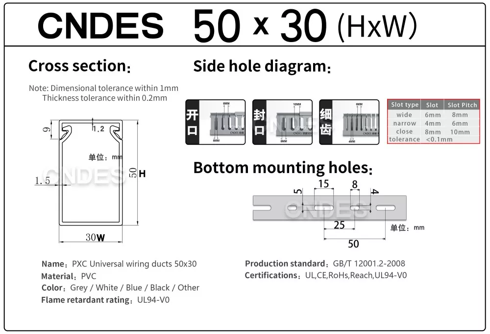 Ống tổ chức cáp PVC có rãnh 50 × 30 chất lượng của CNDES là một giải pháp nhỏ gọn, hiệu quả để quản lý cáp trong không gian chật hẹp, chẳng hạn như tủ điều khiển nhỏ, vỏ dữ liệu và hộp nối thiết bị. Ống nối dây có cấu hình mỏng này cho phép người lắp đặt sắp xếp, tách biệt và bảo vệ cáp mà không chiếm quá nhiều không gian của bảng điều khiển.